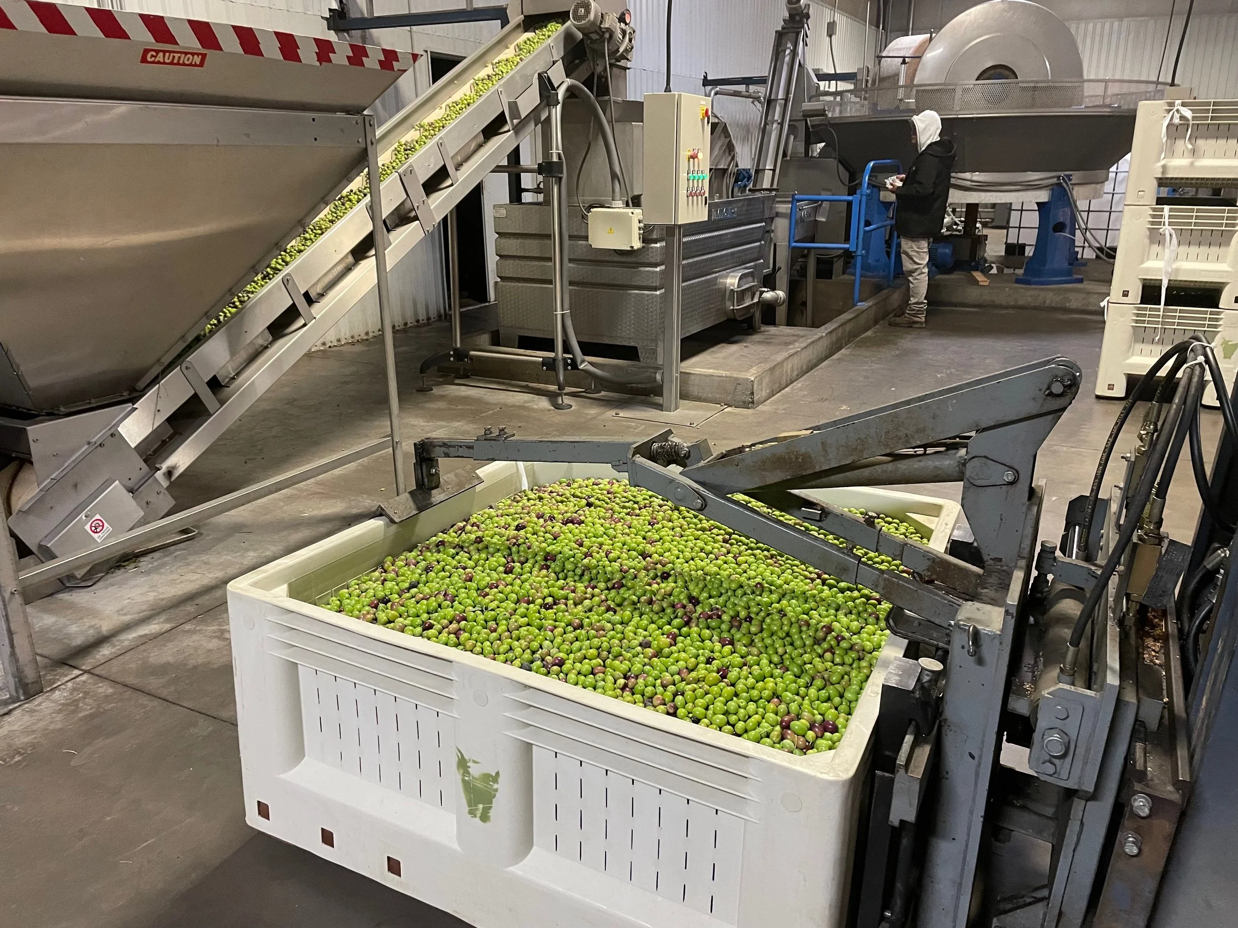 At the end of a harvest day, we truck our fresh-picked olives to the mill. At the mill we have a choice of using a three-wheel granite stone-crusher and or the 3 ton/hour blade crusher. This gives us some options for enhancing the taste profile, since stone crushing will likely yield a softer oil. The milled olives are then passed through a 4 batch malaxer, 3-phase decanter, a final separator, and stored until bottled.